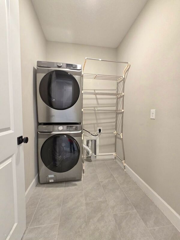 The gorgeous kitchen features a large center island, stainless steel appliances, and ample storage—ideal for both everyday living and entertaining. A washer and dryer are included for tenant convenience.